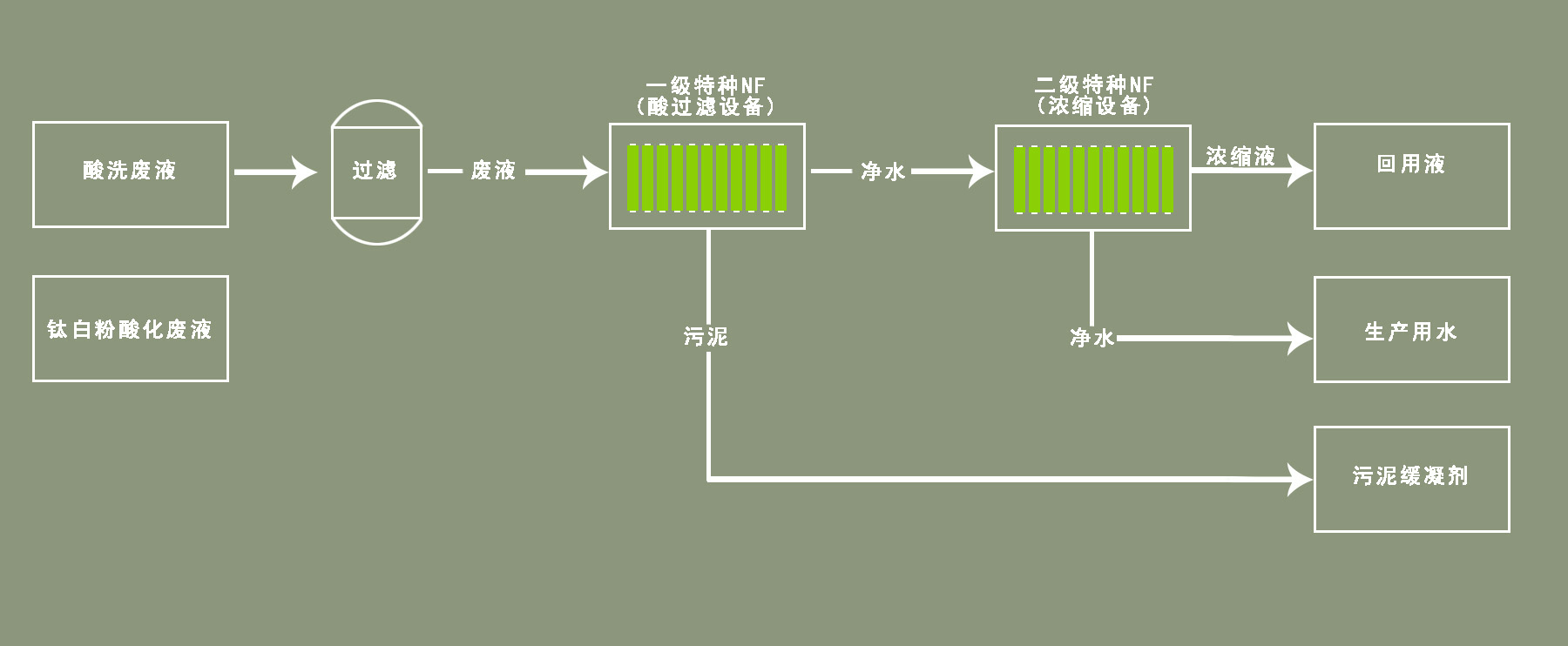 ;透過液再次進(jìn)入二級(jí)納濾膜組件,濃縮成質(zhì)量分?jǐn)?shù)為20%的硫酸,實(shí)現(xiàn)了酸液的再生回收利用。通過這種工藝,我們可以回收硫酸和硫酸亞鐵,實(shí)現(xiàn)酸洗廢液的綜合利用和酸洗廢水達(dá)標(biāo)排放。